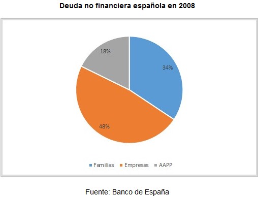 De este modo, los porcentajes cambian un poco: la deuda pública ya no es el 18% del total, sino el 37,5%, y el peso de la deuda empresarial cae del 48% al 35%. A partir de enero de 2014, el sector público pasó a ser el sector institucional con más deuda en España, superando no sólo al sector de las familias, sino también al de las empresas no financieras.