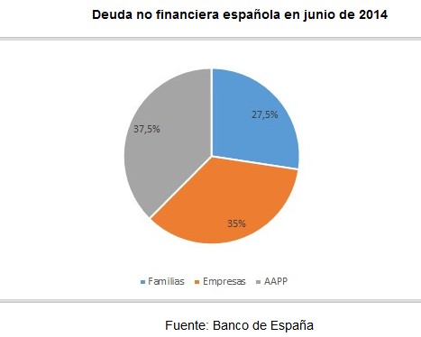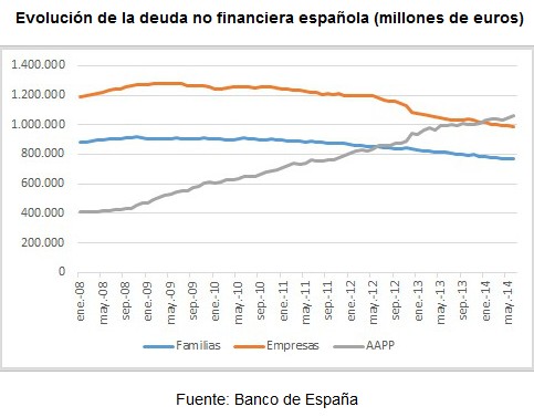 A junio de 2014, y a partir de los datos del Banco de España, la deuda privada familiar es de 772.000 millones de euros, la deuda privada empresarial es de 0,98 billones de euros y la deuda pública de 1,058 billones de euros. Conviene aclarar que los algo más de 50.000 millones de pasivos de empresas públicas los he incluido, a diferencia de lo que hace el Banco de España, entre la deuda pública y no entre la deuda privada empresarial.
