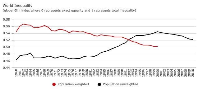 Evidentemente, la metodología más apropiada es la que considera el boom demográfico a la hora de analizar la evolución del Coeficiente Gini. Sin embargo, la línea negra de la siguiente gráfica deja claro que, incluso sin hacer ese cálculo, la tendencia apreciada en la última década es de menos desigualdad global.