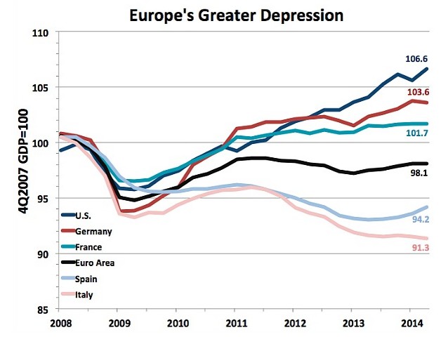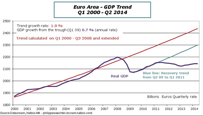La desaceleración que está sufriendo Europa en 2014 impedirá que la zona euro alcance el nivel precrisis de inmediato, y, en este sentido, la cuestión es que la economía de EEUU tardó siete años en recuperar el tamaño registrado en 1929, cuando aconteció el fatídico crack bursátil.