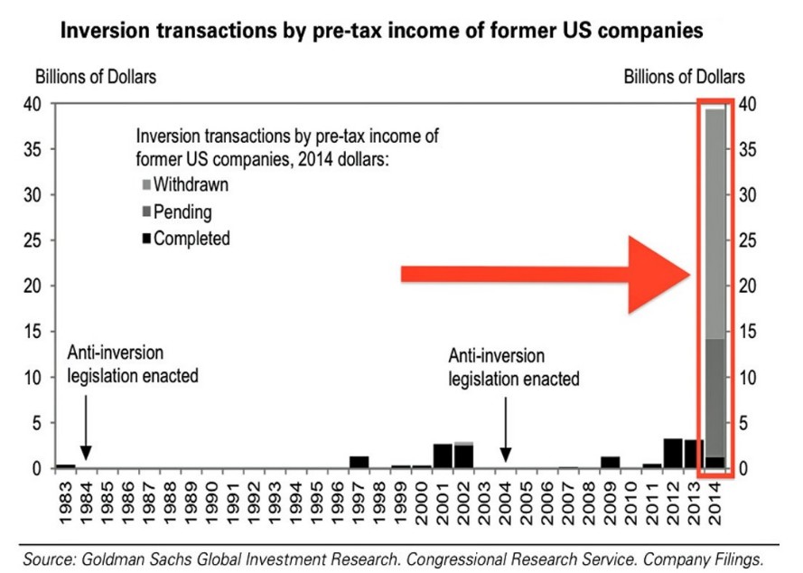 Como vemos en la gráfica siguiente, elaborada por Goldman Sachs, el alcance de las "inversiones tributarias" es cada vez mayor. Aunque estas operaciones empiezan a registrarse ya en los años 80, y a pesar de diferentes leyes aprobadas en 1984 y 2004 para dificultar estos procesos, los años 2012, 2013 y, especialmente, 2014 han estado marcados por el continuo auge de estas operaciones.