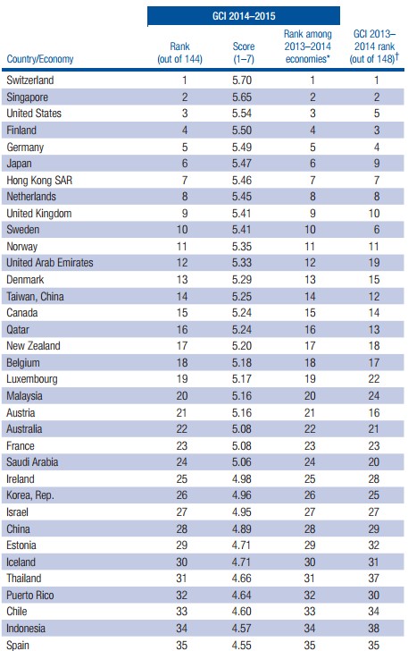 España se mantiene por segundo año consecutivo en el puesto 35 del Índice de Competitividad Global 2014-2015 que acaba de publicar el Foro Económico Mundial, por detrás de Puerto Rico, Chile e Indonesia, y justo por delante de Portugal, República Checa y Azerbayán. Sin embargo, la economía nacional ha retrocedido seis puestos en la clasificación internacional desde que estalló la crisis, ya que ocupaba la posición 29 en 2008, a la altura de Chile o China.
