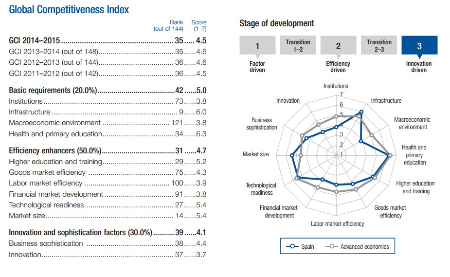 En general, al igual que en años anteriores, el país sigue gozando de unas buenas infraestructuras en materia de transporte y de un alto nivel de acceso a la educación universitaria, aunque la entidad advierte en este último caso de la escasa calidad del sistema educativo español (puesto 88 del mundo) y pone en cuestión su utilidad real a la hora de proporcionar una fuerza laboral lo suficientemente preparada para contribuir al profundo cambio estructural que precisa el país.