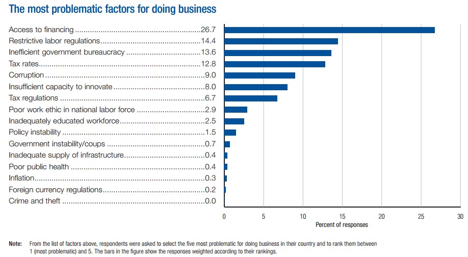 Las dificultades para acceder a la financiación encabeza esta particular lista de trabas (puesto 132 del mundo); seguida de la enorme rigidez laboral (120), la debilidad institucional (73), con especial mención a la ineficiente burocracia estatal; la elevada fiscalidad (127); la corrupción, que escala hasta situarse como el quinto mayor lastre del país; los problemas para atraer (103) y retener talento (107); o la insuficiente capacidad para innovar (60), debido a la baja inversión en I+D (52) o la escasa colaboración existente entre universidad y empresa (57).