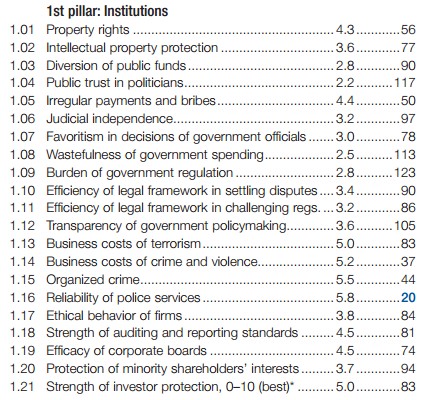 En este ámbito, España destaca por la baja confianza en los políticos (puesto 117 del mundo); la corrupción, pagos irregulares y sobornos (50); independencia judicial (97); favoritismo en las decisiones del gobierno, también conocido comúnmente como capitalismo de estado (78); despilfarro en el gasto público (113); cargas regulatorias (123); seguridad jurídica en materia de disputas (90) y legislación (86); o transparencia política (105), entre otros factores.