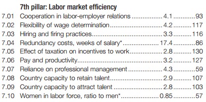 No hay no un sólo factor que se salve en materia laboral, pese a los positivos avances que introdujo la reforma de 2012: escasa cooperación entre empresarios y trabajadores (93), rigidez salarial (117), elevados costes laborales (86), altos impuestos sobre el trabajo (130), débil capacidad para atraer (103) y retener talento (107), etc.