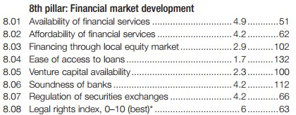 La peor puntuación en este ámbito tiene que ver con el escaso nivel de financiación empresarial mediante la emisión de acciones (102), las dificultades para acceder al crédito (132), el desarrollo de instrumentos de capital riesgo (100) y la solidez de la banca (112).