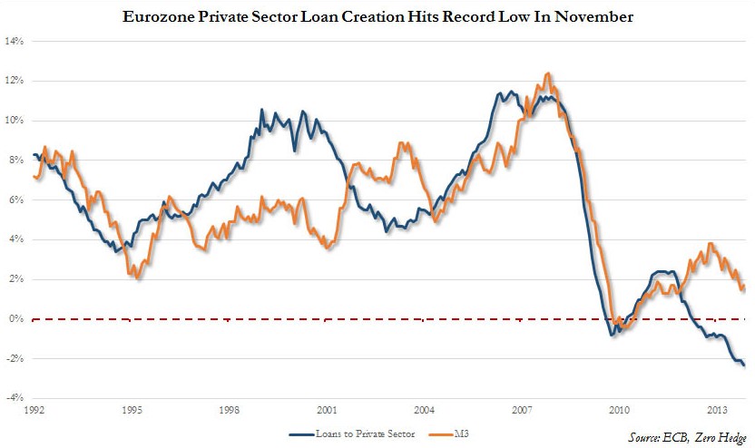 Tal y como avanzó Libre Mercado el pasado febrero, la mayor preocupación del BCE se resume en el siguiente gráfico, en donde se observa la caída del crédito a empresas y familias en el conjunto de la Unión.