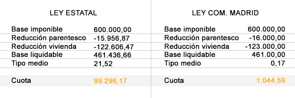 Los asesores fiscales de TGS Edisa han recogido en un ejemplo cómo un residente en Reino Unido recibe por fallecimiento de su padre, residente en la Comunidad Madrid, una herencia valorada en 600.000 euros, entre los que se encuentra la vivienda habitual. Como se observa en la siguiente tabla, la diferencia impositiva entre residir en Reino Unido y no hacerlo en Madrid alcanza la friolera de los 98.252 euros.