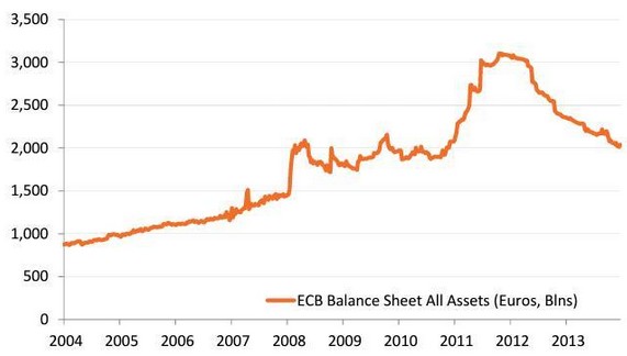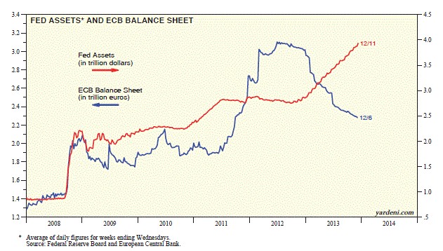 La divergencia que presentan ambas monedas desde mediados de 2012 responde, básicamente, que la FED ha inyectado 1,5 billones de dólares en el mercado mientras que el BCE ha retirado cerca de un billón de euros debido a la amortización de las líneas extraordinarias de liquidez concedidas a la banca de la zona euro a finales de 2011 y principios de 2012.