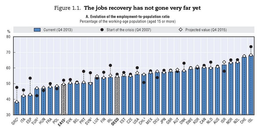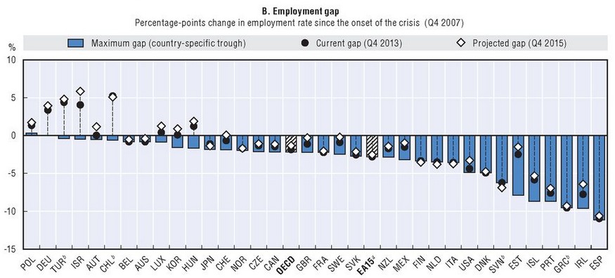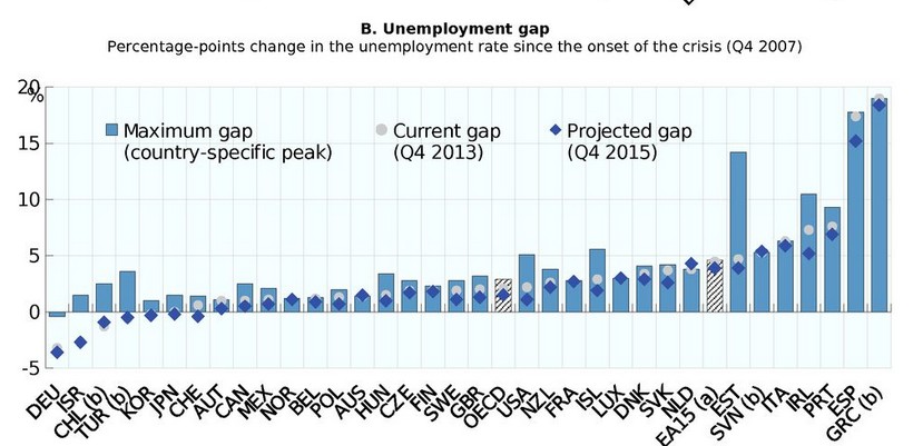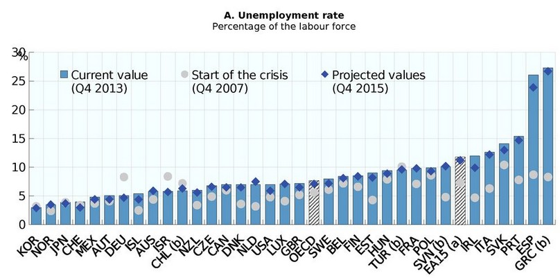 En mayo de 2014, último dato que recoge el estudio, Grecia encabezaba la tasa de paro de la OCDE, con un 26,8%, junto a España (25,1%), seguidos de Portugal (14,3%), Eslovaquia (13,9%), Italia (12,6%), Irlanda (12%) y Francia (10,1%). En el lado opuesto, se situaban Noruega (3,3%), Japón (3,5%), Corea del Sur (3,7%), Austria (4,7%), Suiza (4,8%), México (4,9%) y Alemania (5,1%).