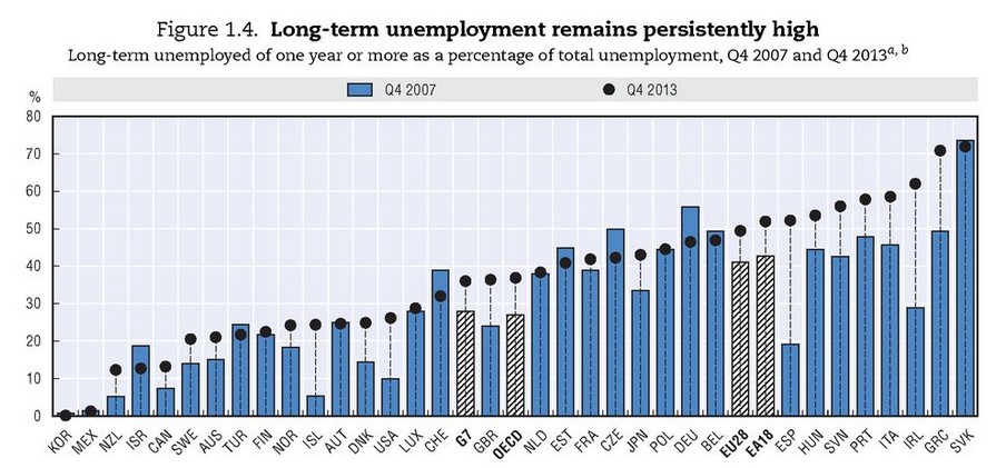 Lo mismo sucede en cuanto al desempleo de larga duración (más de un año buscando trabajo). España no lidera esta variable (52,2%), ampliamente superada por Eslovaquia, Grecia, Irlanda, Italia, Portugal, Eslovenia y Hungría, con ratios que oscilan entre el 53% y el 72%, pero ha sufrido el mayor aumento de la OCDE durante la crisis (+33,1 puntos porcentuales desde 2007) junto a Irlanda.