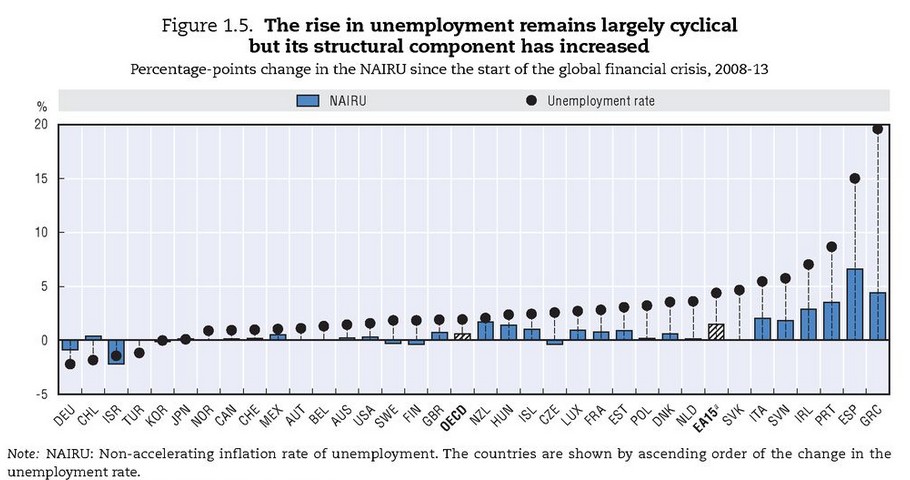El drama del paro responde, en parte, a la dura recesión experimentada durante los pasados años, y, por tanto, a la presente coyuntura económica, pero parte de este aumento es estructural (el desempleo sube con independencia de la crisis), lo cual la OCDE refleja bajo un indicador denominado NAIRU (tasa de desempleo no aceleradora de la inflación). La cuestión es que España también lidera esta variable, con un aumento de 6,6 puntos durante la crisis, por encima de Grecia (4,4) y hasta diez veces más que la media de la OCDE (0,6).