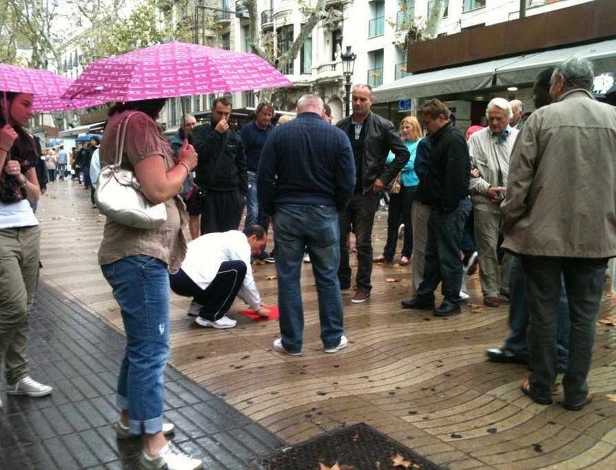 La estafa consiste en incitar a los transeúntes a apostar dinero por descubrir dónde se esconde una bolita tapada con vasos o chapas. Suelen tener un cómplice que simula apostar y acertar, ganando grandes cantidades de dinero para que los allí presentes hagan lo mismo. Éstos sin embargo, no ganan I Flickr / Stéphane M. Grueso.