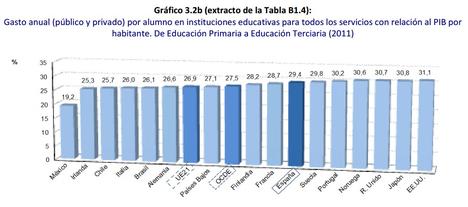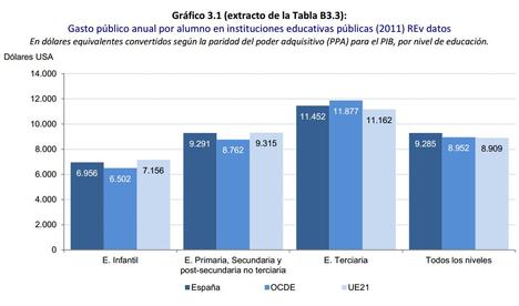 En 2011, España mantuvo un gasto público total por alumno en la educación pública ligeramente superior al promedio de la OCDE y de la UE-21 (los países de la UE que pertenecen a la OCDE): 9.285 dólares en España frente a 8.952 del promedio de la OCDE y 8.909 en la UE-21. Por niveles educativos, el gasto público en Educación Infantil, Primaria y Secundaria en la UE-21 es algo superior al gasto en España pero inferior en Educación Terciaria. Es cierto que el gasto total sobre el PIB fue ligeramente inferior a la media (3,2% en educación primaria y secundaria frente al 3,6% en la UE-21 y 3,8% en la OCDE), algo que se explica por el menor número de estudiantes.