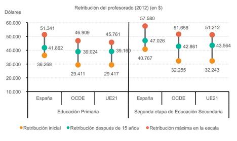 Por ejemplo, la retribución inicial media en 2011 en Educación Primaria era de 36.268 dólares, por los 29.411 dólares de media en la OCDE y los 29.417 dólares en la UE-21. La misma tendencia se puede observar en los profesores con 15 años de carrera y en la retribución máxima en la escala: en todos los casos, España paga más a sus maestros. Y lo mismo sucede en Educación Secundaria.