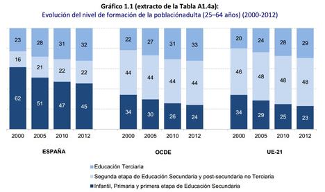 Según los datos de la OCDE. En 2012, entre los españoles de entre 25 y 34 años, sólo el 64% tenía, como mínimo, una titulación equivalente a educación secundaria superior (bachillerato o FP superior). En la UE-21, este porcentaje es del 84% y en la OCDE del 82%. O lo que es lo mismo: el 36% de los jóvenes adultos españoles carece de una titulación que le capacite para un mercado de trabajo desarrollado.