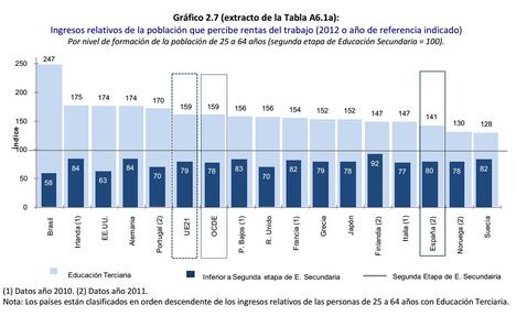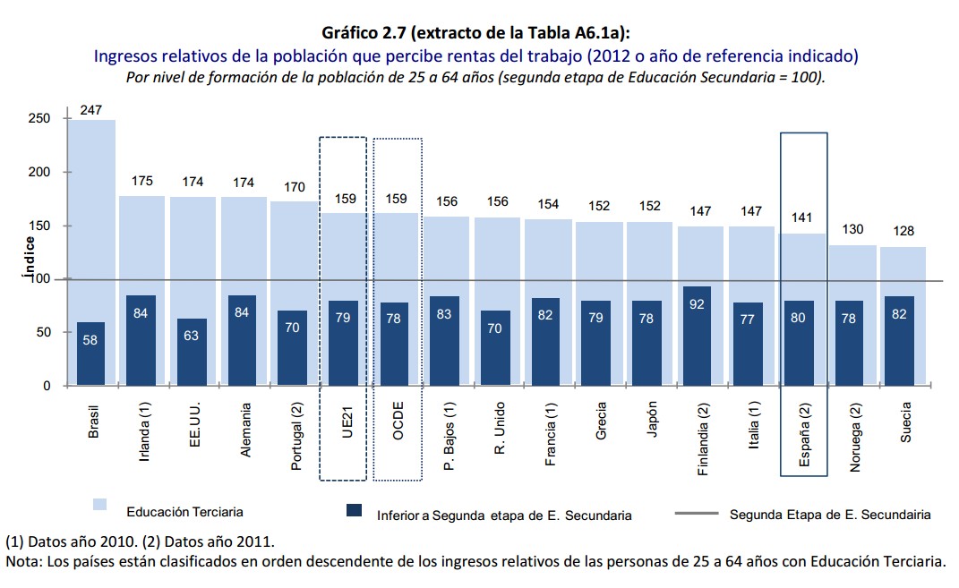 Hasta aquí, hemos visto que los licenciados españoles están peor preparados y tienen tasas de paro más elevadas que los de la OCDE. Quizás como consecuencia de ello, también cobran menos. No hablamos sólo de términos absolutos, algo que quizás podría achacarse al mercado laboral español. El informe presentado este martes mide el premio por estudiar. Es decir, cuanto gana un licenciado universitario en comparación con otros trabajadores sin titulación. En todos los países, tener un título superior implica un sueldo más alto. Pero en España, la diferencia es relativamente pequeña. Suponiendo un salario de 100 para una persona con educación secundaria superior, el universitario se lleva 141. Sólo Noruega y Suecia tienen un ratio menor. Pero allí es por la razón contraria: los salarios están igualados porque todos cobran mucho; aquí la nivelación es a la baja.