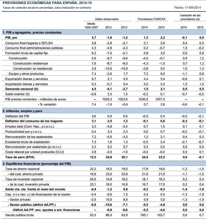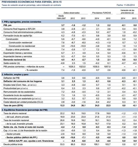 La economía española crecerá este año un 1,3%, una décima porcentual menos de lo estimado en las anteriores previsiones de la Fundación de las Cajas de Ahorros (Funcas). La razón es el menor crecimiento esperado para el segundo semestre del año, tal como anticipan los últimos indicadores conocidos. Para 2015 se mantiene la previsión de un incremento del PIB del 2,2%.