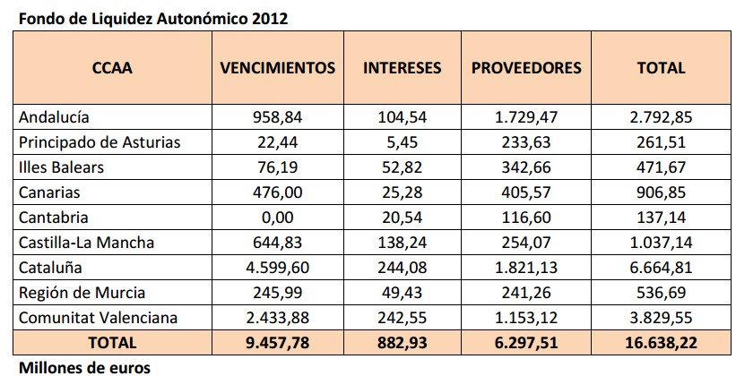 En concreto, a lo largo de 2012, primer año de funcionamiento, las nueve CCAA que precisaron ayuda financiera percibieron unos 16.640 millones de euros, distribuidos de la siguiente forma: 9.458 millones para vencimientos de deuda, 883 para pago de intereses y 6.300 millones para proveedores.
