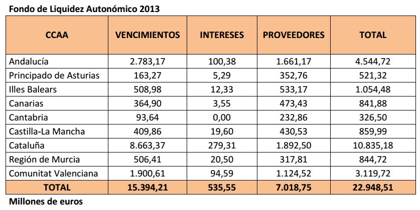 En 2013, la cuantía a repartir rozó los 23.000 millones: 15.394 millones de euros para vencimientos de principal de deuda financiera, 535 millones para gastos por intereses, y algo más de 7.000 millones para proveedores y acreedores de las CCAA.