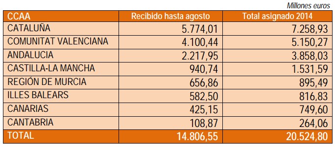 Por último, Hacienda ha repartido unos 14.800 millones hasta el pasado agosto, de los 20.525 millones asignados inicialmente para todo 2014. De esta cantidad, un total de 6.534 millones han ido directamente al pago de proveedores.