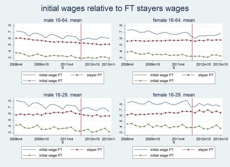 - "Los resultados para los jóvenes de 16 a 29 son aún más alarmantes, ya que las pérdidas salariales son mucho más elevadas. Su primer salario en un nuevo contrato a tiempo completo cae alrededor de 15 y 12 puntos porcentuales para mujeres y hombres (24 y 21 en términos reales) y, más importante aún, sus salarios a tiempo parcial, se hunden alrededor de 28 puntos porcentuales (37 contando con la inflación). Por lo tanto, los jóvenes sufren un triple castigo: por ser entrantes, por ser jóvenes y por ocupar, en mucha mayor proporción, puestos de trabajo a tiempo parcial".