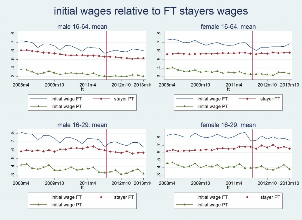 Aún más dolorosa es la comparación entre las personas que llegan a un nuevo empleo y los stayers (personas que llevan más de dos años en su puesto de trabajo). La lógica dice que los primeros tendrán unos sueldos más elevados que los segundos, incluso aunque tengan un puesto de trabajo similar. Pero durante la crisis el margen entre unos y otros se ha agrandado: "El salario de los movers a tiempo parcial, que empezó en un 40% de los stayers a tiempo completo, es ya sólo del 30%, acentuando la sensación de precariedad de dichos entrantes, mucho más numerosos hoy".