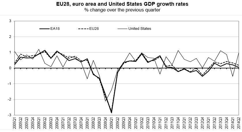 La economía de la zona euro se estancó en el segundo trimestre del año, tras avanzar un tímido 0,2% entre enero y marzo, debido a la contracción de la locomotora alemana (-0,2%), el nulo crecimiento de Francia y la recaída en recesión de Italia.