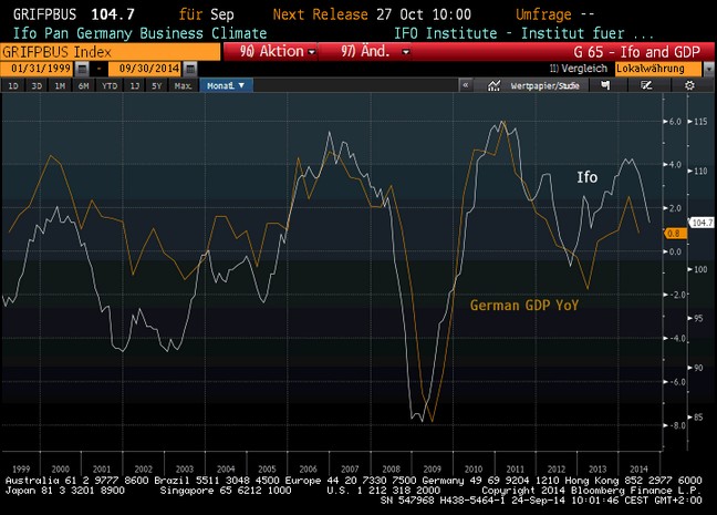 El Instituto de Investigación Económica alemán (IFO) indicó este miércoles que el índice de confianza empresarial en el conjunto de Alemania bajó en septiembre por quinto mes consecutivo hasta 104,7 puntos, el nivel más bajo desde abril de 2013, desde los 106,3 puntos de agosto. Los expertos consideran que se produce un cambio de tendencia en la confianza empresarial cuando el indicador se modifica tres meses consecutivos.
