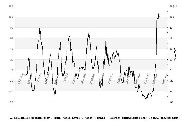 Un menor consumo privado que, en todo caso, está siendo compensado con el sustancial incremento de la inversión pública que está llevando a cabo el Ministerio de Fomento en los últimos meses, tal y como muestra el siguiente gráfico -vía Juan Carlos Barba-.