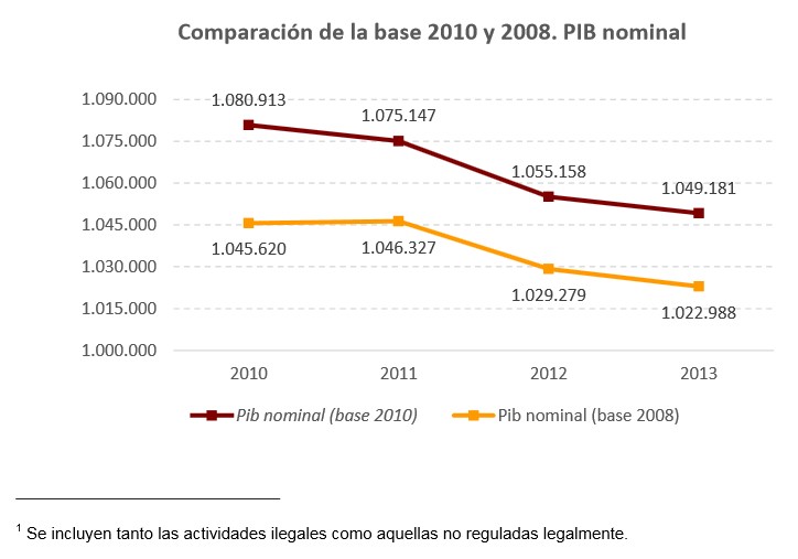 Como consecuencia, el INE ha revisado al alza el PIB nominal de los últimos años, tal y como refleja el siguiente gráfico. En 2010, pasa de 1.045.620 millones de euros a 1.080.913 millones (35.293 millones más). De este incremento, los cambios metodológicos suponen un 1,55%, mientras que las actividades ilegales representan el 0,87% del PIB. En concreto, la prostitución supone un 0,35% y las drogas un 0,50%, lo que equivaldría a 9.187 millones de euros (3.783 millones la prostitución y 5.404 millones las drogas). Mientras, en 2013, el PIB sube en 26.193 millones, hasta situarse en un total de 1,049 billones.