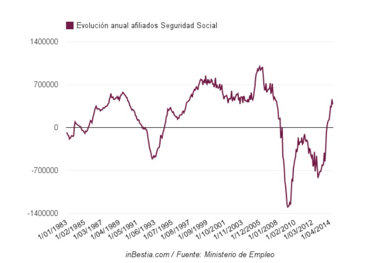 1. Por un lado, la economía española sigue creciendo como muestran los indicadores que mejor reflejan lo que está ocurriendo en la actualidad; es el caso del número de afiliaciones laborales en la Seguridad Social (figura 1), que en agosto de 2014 alcanzaron las 16.649.520 ó 378.074 más que el año anterior. Esto, sin duda, es un factor alcista para la bolsa.