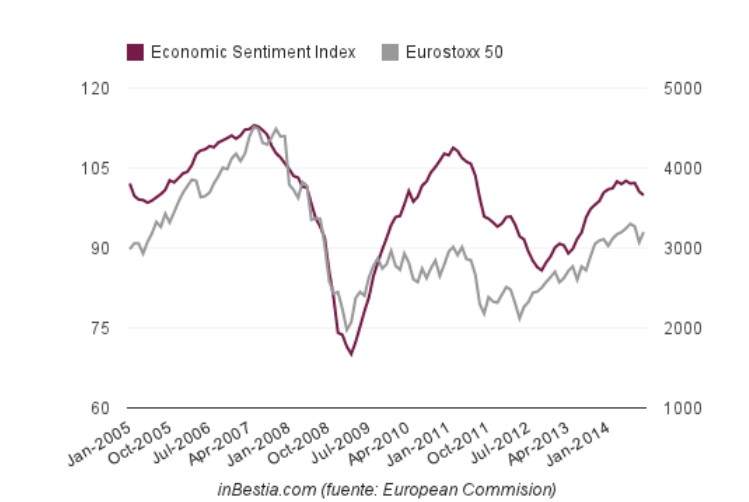 La mejor muestra es el Índice de Sentimiento Económico (ISE) que elabora Eurostat, la agencia estadística de la Comisión Europea, y que se obtiene tras realizar una encuesta masiva a 125.000 firmas y a 40.000 consumidores de toda Europa. ¿Y qué señala este indicador? Que el sentimiento económico en Europa se está deteriorando rápidamente al alcanzar el ISE los 99,9 puntos en septiembre, el nivel más bajo desde noviembre de 2013.