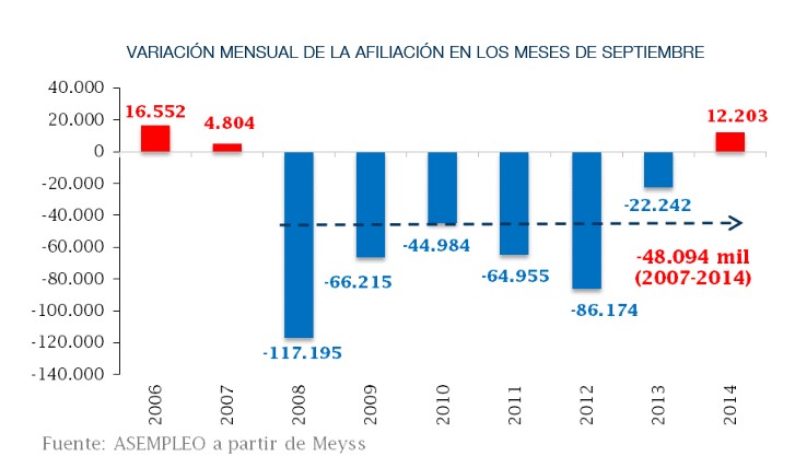 Septiembre es tradicionalmente malo para el empleo debido al fin de la campaña veraniega y a la consiguiente destrucción de puestos de trabajo en el sector servicios, pero el mes que acaba de finalizar ha sido el menos malo de toda la crisis, y, de hecho, una vez eliminado el efecto estacional, el paro baja y la afiliación sube, lo cual es un dato positivo.