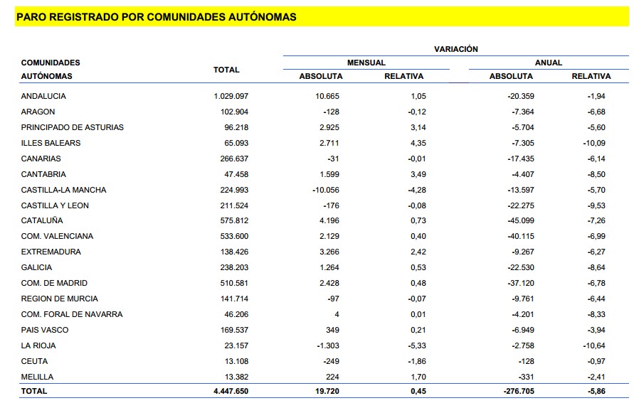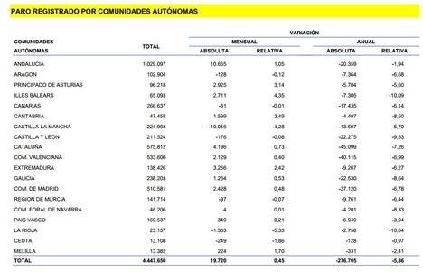 Estos datos contrastan, además, con el leve aumento del desempleo registrado en la Comunidad de Madrid (+2.428), cuyo peso económico es similar o incluso superior al de Cataluña y Andalucía.