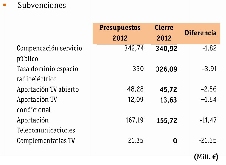 - Aportaciones de operadores de telecomunicaciones y de televisión: las telecos y las teles privadas están obligadas por Ley a financiar a RTVE. Según las últimos resultados económicos publicados en su web (correspondientes a 2012; ver cuadros con el detalle al final del artículo), hablamos de unos 215 millones de euros por estas aportaciones.