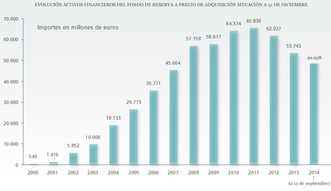 Las cuentas son sencillas: quedaban 49.598 millones a mediados de septiembre, lo que quiere decir que en los ocho primeros meses del año su cuantía se ha reducido en 4.000 millones. Todo apunta a que en lo que queda de 2014, habrá que seguir tirando del Fondo. En los Presupuestos para 2014 (pag. 56) se prevé una utilización de activos por valor de más de 11.000 millones de euros.