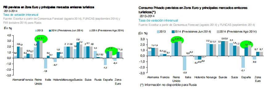 No obstante, aparte de debilidades que puedan afectar a este sector también hay fortalezas. La depreciación del euro frente al dólar y la libra es una variable que está mejorando la competitividad/precio de los destinos españoles. Por otra parte, la paulatina recuperación del gasto asociado a los viajes de los españoles en el cierre del 2014 fruto de la mejora de la confianza y de los niveles de empleo en nuestro país.
