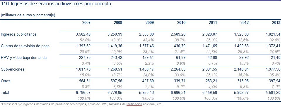 - La facturación por publicidad, las cuotas de la televisión de pago, el sistema pay per view (PPV) y otros ingresos: el sector ingresó por esta vía 3.613,3 millones de euros en 2013, un 3,9% menos a nivel interanual, pero un desplome superior al 37% respecto a 2007 (2.155 millones menos). La mayor caída se concentra en los ingresos publicitarios, con un descenso de 1.761 millones durante la crisis (-49%), al pasar de 3.582,5 a 1.821,5 millones de euros.