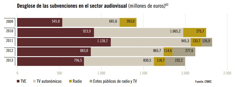 El siguiente cuadro indica el reparto concreto de dichas subvenciones entre los principales medios públicos a lo largo de los últimos años. En este sentido, cabe destacar que en 2009 se aprobó la Ley 8/2009 de Financiación de la Corporación de Radio y Televisión Española, que suprimió la emisión de publicidad por parte de la Corporación y, desde ese momento, pasó a financiarse exclusivamente con recursos públicos, el canon impuesto a las teles privadas y, de forma residual, mediante la comercialización de productos y patrocinios culturales o deportivos.