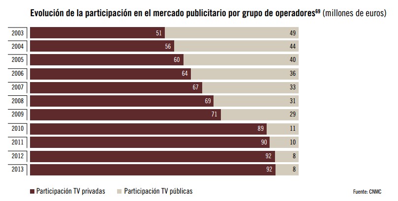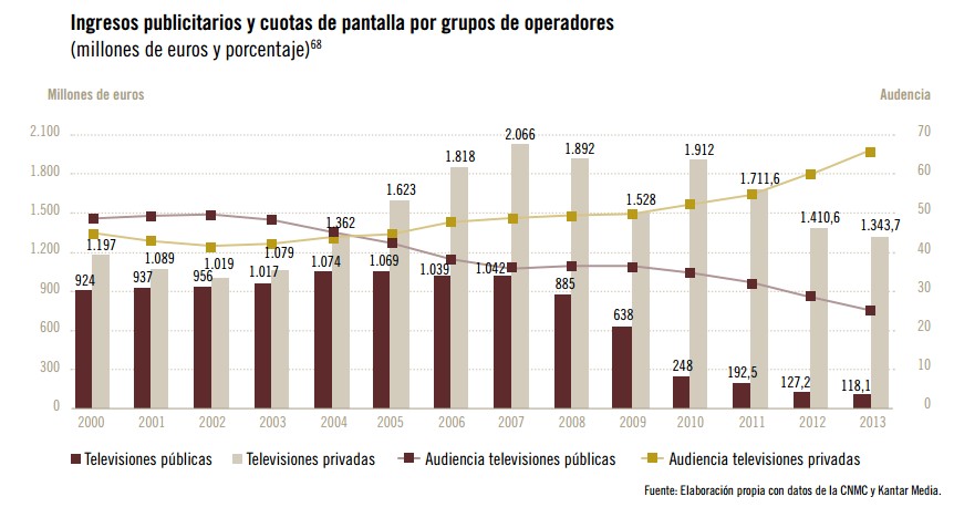 Así, las privadas han perdido una parte sustancial de sus ingresos por publicidad, a pesar de que han seguido ganando cuota de pantalla durante la crisis, hasta copar casi el 65% de la audiencia en 2013. Por el contrario, los ingresos publicitarios en las públicas casi se han diezmado, al tiempo que seguido perdiendo audiencia.