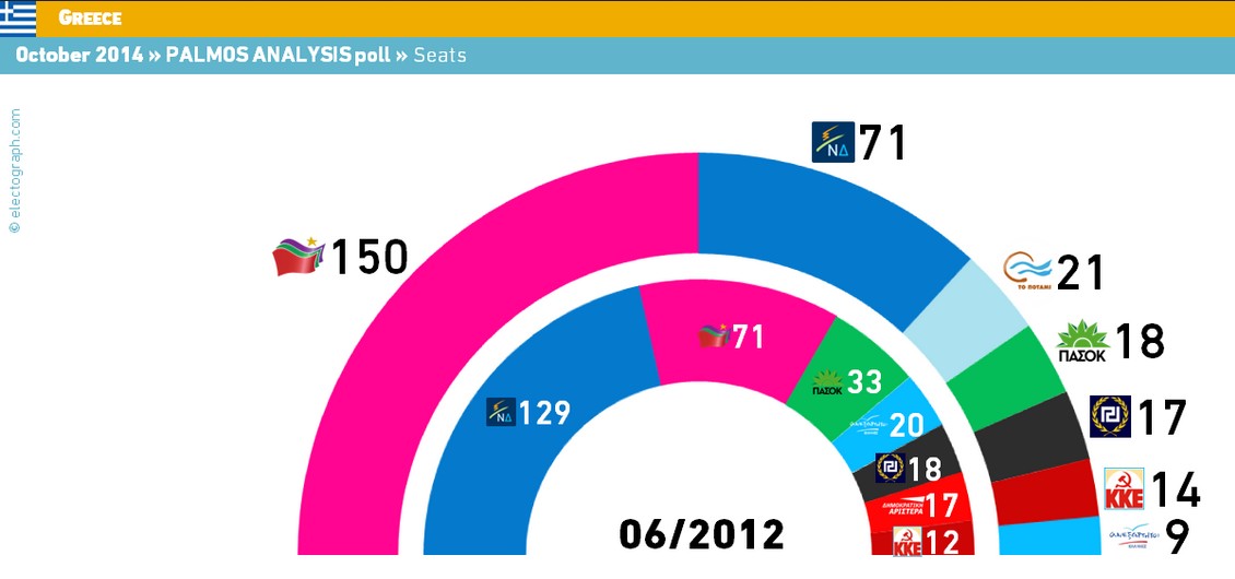 Los comunistas de Syriza (un partido muy similar a Podemos en España) lograrían la mayoría con el 35,5% de los votos estimados y 150 escaños, mientras que Nueva Democracia (el PP griego) y Pasok (PSOE) se desplomarían aún más. Además, cabe recordar que, según las reglas electorales que rigen en Grecia, al partido o coalición que venza en los comicios, aunque sea por la mínima, logra 50 escaños extra para gobenar con mayoría absoluta.
