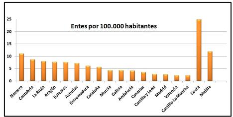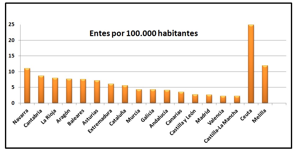 Si comparamos el número de entes en función de los habitantes, la peor situada sería Navarra, con 70 organismos para sus 636.000 habitantes, aunque quizás la excusa esté en el carácter foral de la región. Además, parece lógico que las regiones más pequeñas (Cantabria, La Rioja o Navarra) salgan peor en esta foto, aunque tengan pocos organismos, por una mera cuestión de economías de escala.