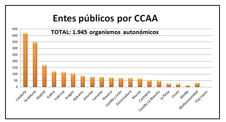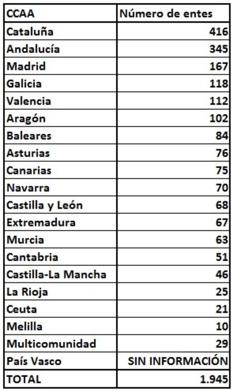 Como puede verse, Andalucía y Cataluña encabezan la clasificación. Esto puede tener cierto sentido, puesto que son las dos regiones más pobladas. Lo sorprendente es la diferencia entre estas dos autonomías y Madrid, una región con una población y PIB total similar. Así, mientras la Comunidad de Ignacio González mantiene abiertos 167 entes, la de Susana Díaz acumula 345 (más del doble) y la de Artur Mas, ¡416!