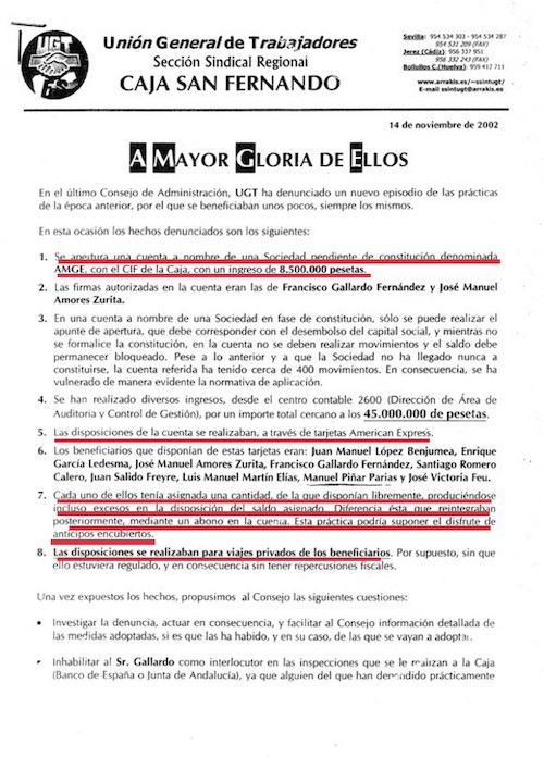 UGT ya denunció la existencia de tarjetas negras en Caja San Fernando, como publicó Libertad Digital en noviembre de 2008. La denuncia de UGT no fue desinteresada sino que se produjo en el marco de la fusión de las cajas andaluzas inspirada por Manuel Chaves. De hecho, en la operación de acoso y derribo de Isidoro Beneroso y Juan Manuel López Benjumea, presidentes de El Monte y Caja San Fernando respectivamente, ambos socialistas, participaron en un pacto de trastienda el PSOE, IU, UGT y CCOO.