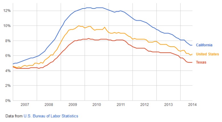 El resultado de este ejercicio comparativo es claro: por cada empleo creado en California desde 2007, en Texas se han generado cuarenta. En términos de empleo, Texas arroja una tasa de paro del 5,1%, por debajo de los niveles registrados en California (7,4%) y el resto del país (6,2%).