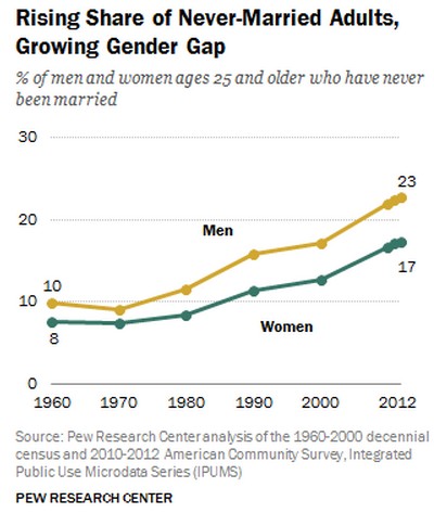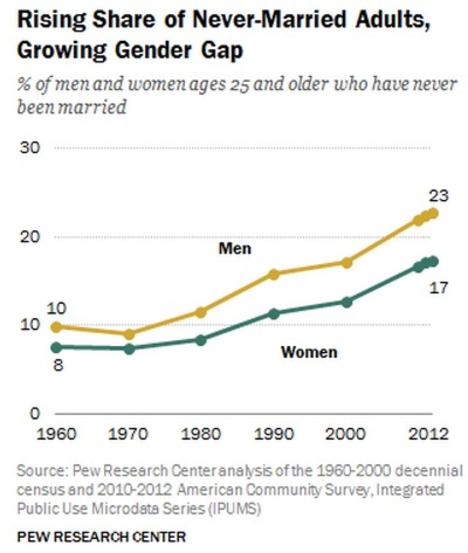 Lo cierto es que las cifras llaman la atención. Según el informe del Pew Center, entre los mayores de 25 años, el 23% de los hombres norteamericanos y el 17% de las mujeres nunca han estado casados. En 1960 los porcentajes eran del 10 y el 8% respectivamente.