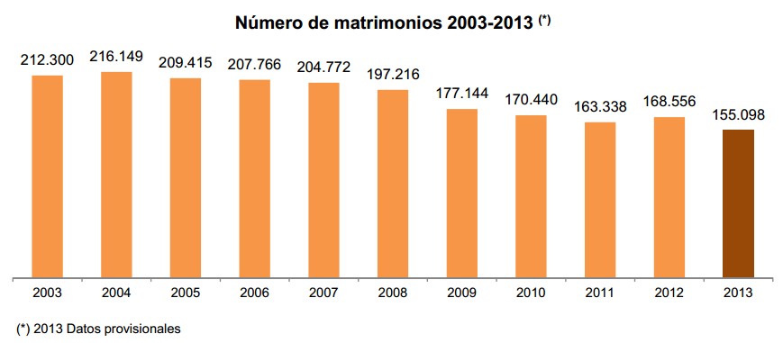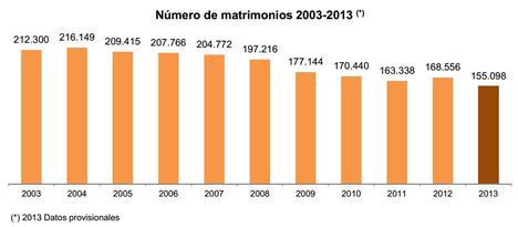 En nuestro país, todo apunta a que recorremos un camino parecido, algo por otro lado normal en las sociedades occidentales. Sólo en la última década, según los indicadores demográficos básicos del INE, el número de matrimonios ha caído de los 216.149 de 2004 a los apenas 155.098 del pasado año. Por comparar, en 1975, con diez millones menos de habitantes, superaban los 270.000. No es extraño que la tasa de nupcialidad (matrimonios por mil habitantes) haya pasado de 7,2 a 3,3 en apenas cuarenta años.