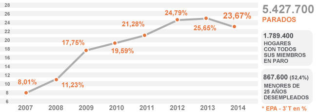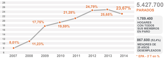 Así, la tasa de paro bajó ocho décimas en el tercer trimestre, hasta situarse en el 23,67%, experimentando esta tasa su mayor descenso en un tercer trimestre desde 2005. La tasa de paro no bajaba del 24%, desde el último trimestre de 2011. En el último año, el paro se ha reducido un 8,7%, con 515.700 desempleados menos.